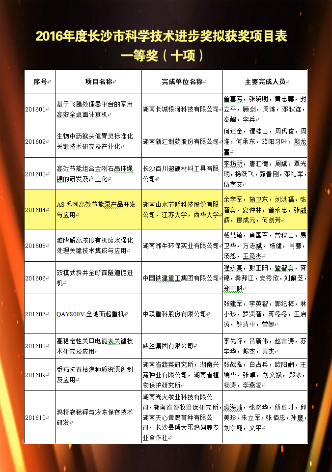 近日,2016年度長沙市科學技術進步獎獲獎項目已全部揭曉。湖南山水節(jié)能科技股份有限公司攜《AS系列高效節(jié)能泵產(chǎn)品開發(fā)與應用》項目喜獲長沙市科學技術進步獎一等獎,是此次水泵行業(yè)少有殊榮的企業(yè)。