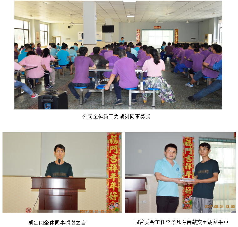 病魔無情,人間有情,為胡劍加油!山水家人們紛紛伸出援助之手,慷慨解囊、熱心救助。通過8月14日至8月16日三天的募捐活動,共募集員工個人捐款21108元,以及瞿總代表公司捐款21008元、管委會捐款10504元,合計52620元,用于對胡劍家人的救助,山水這個大家庭大事有人管、小事有人做、難事有人幫、急事有支撐。