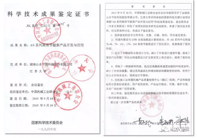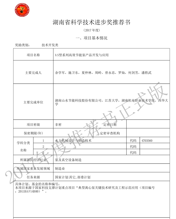湖南山水節(jié)能科技股份有限公司、江蘇大學(xué)、湖南機(jī)電職業(yè)技術(shù)學(xué)院、西華大學(xué)完成的AS型系列高效節(jié)能泵產(chǎn)品開發(fā)與應(yīng)用獲得省科技進(jìn)步獎(jiǎng)。