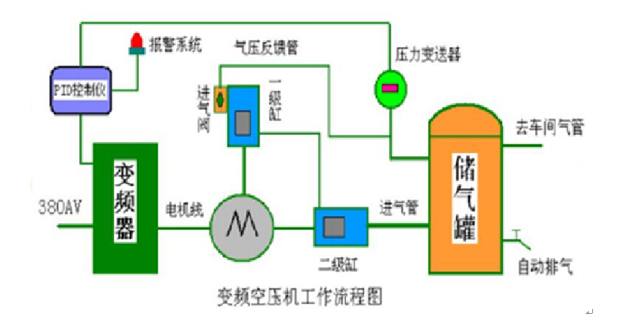 變頻控制系統(tǒng)具有精確的壓力控制能力。通過使空壓機(jī)的空氣壓力輸出與用戶空氣系統(tǒng)所需的氣量相匹配,可以使管網(wǎng)的系統(tǒng)壓力保持恒定,有效地提高了供氣的質(zhì)量。