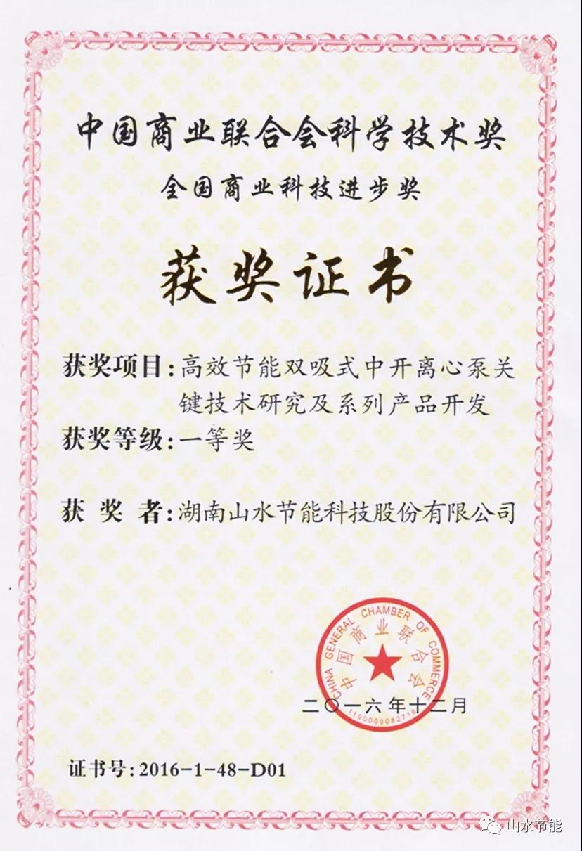 經機械工業(yè)排灌機械產品質量檢測中心檢測,本項目研究的產品效率高,高效范圍寬,性能優(yōu)于國家標準要求,試驗效率高于國家標準的規(guī)定值1~12個百分點,效率指標高于國內外同類產品測試,經眾多用戶使用,實用性強,效果良好。專家鑒定其綜合技術指標達到國際先進水平。2018年9月17日,2018年全國商業(yè)科技質量大會在北京人民大會堂隆重召開。全國商業(yè)科技獎是經國家科技部批準設立的我國商業(yè)行業(yè)科技創(chuàng)新方面最具權威的綜合性獎項,旨在獎勵在全國商業(yè)行業(yè)科學研究、技術與管理創(chuàng)新、成果推廣、高新技術產業(yè)化中做出突出貢獻的組織、個人和科研項目。