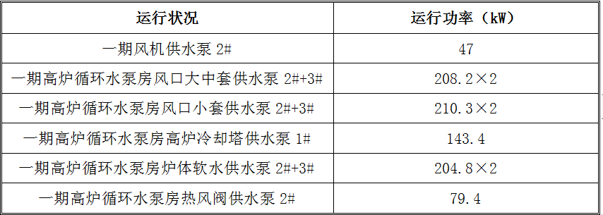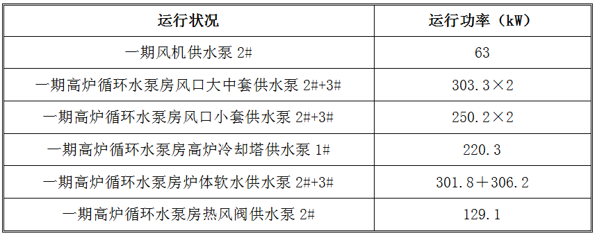 我們針對甲方一期風機供水泵系統(tǒng)、一期高爐循環(huán)水泵房風口大、中套供水泵系統(tǒng)、一期高爐循環(huán)水泵房風口小套供水泵系統(tǒng)、一期高爐循環(huán)水泵房高爐冷卻塔供水泵系統(tǒng)、一期高爐循環(huán)水泵房爐體軟水供水泵系統(tǒng)進行現(xiàn)場檢測和調(diào)研。發(fā)現(xiàn)原系統(tǒng)運行功率偏大。具體如下: