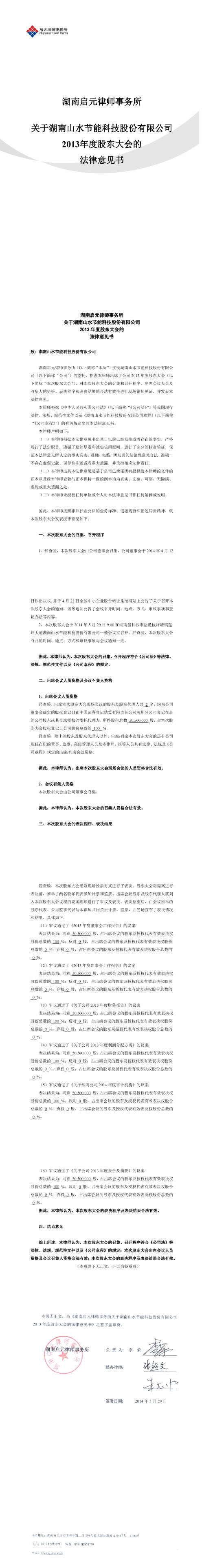 山水節(jié)能 2013年度股東大會(huì)法律意見書